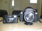 コンパクトカメラとの大きさ比較写真です。→ さすがに手持ちでこれだけ大きいと、持ち手もがっちり。フィルムはカメラの本体とほぼ同じ大きさです。